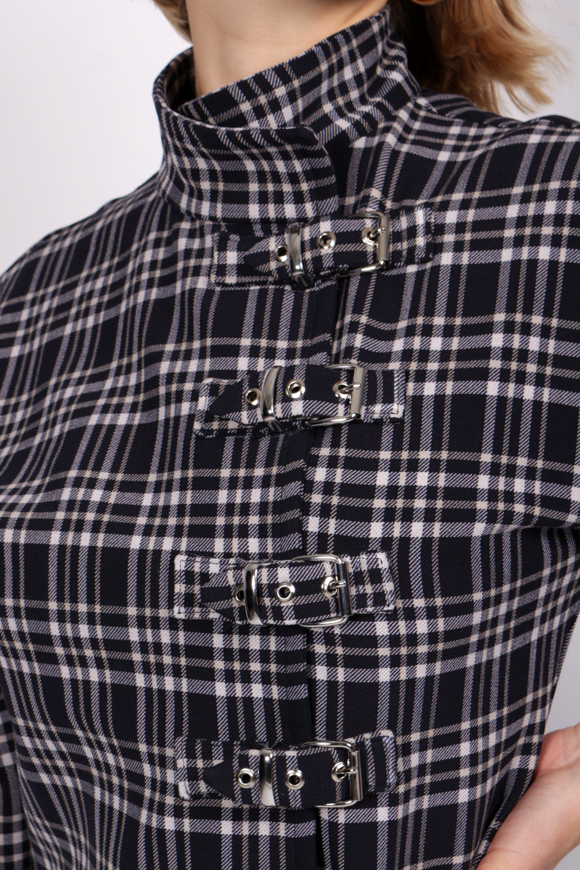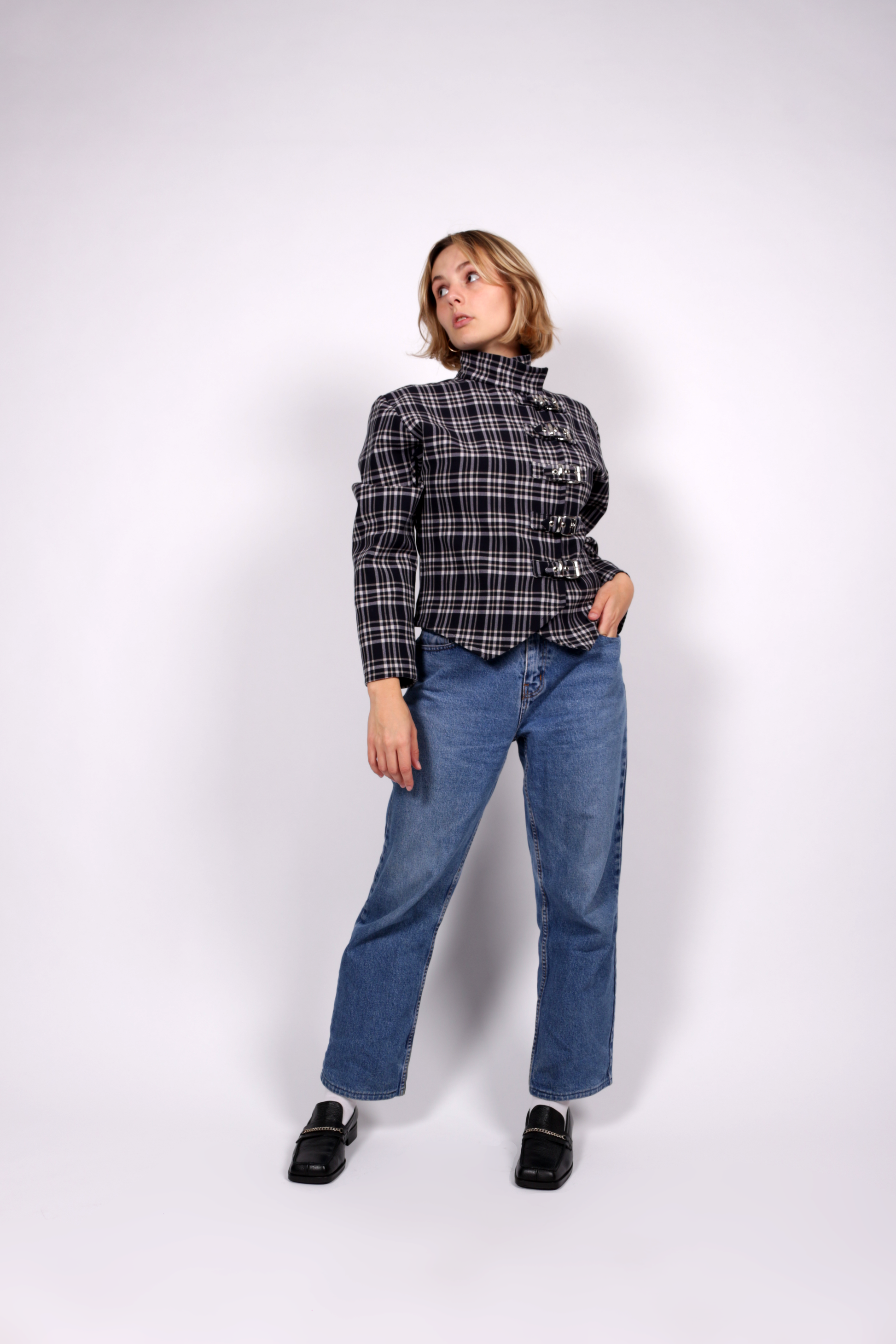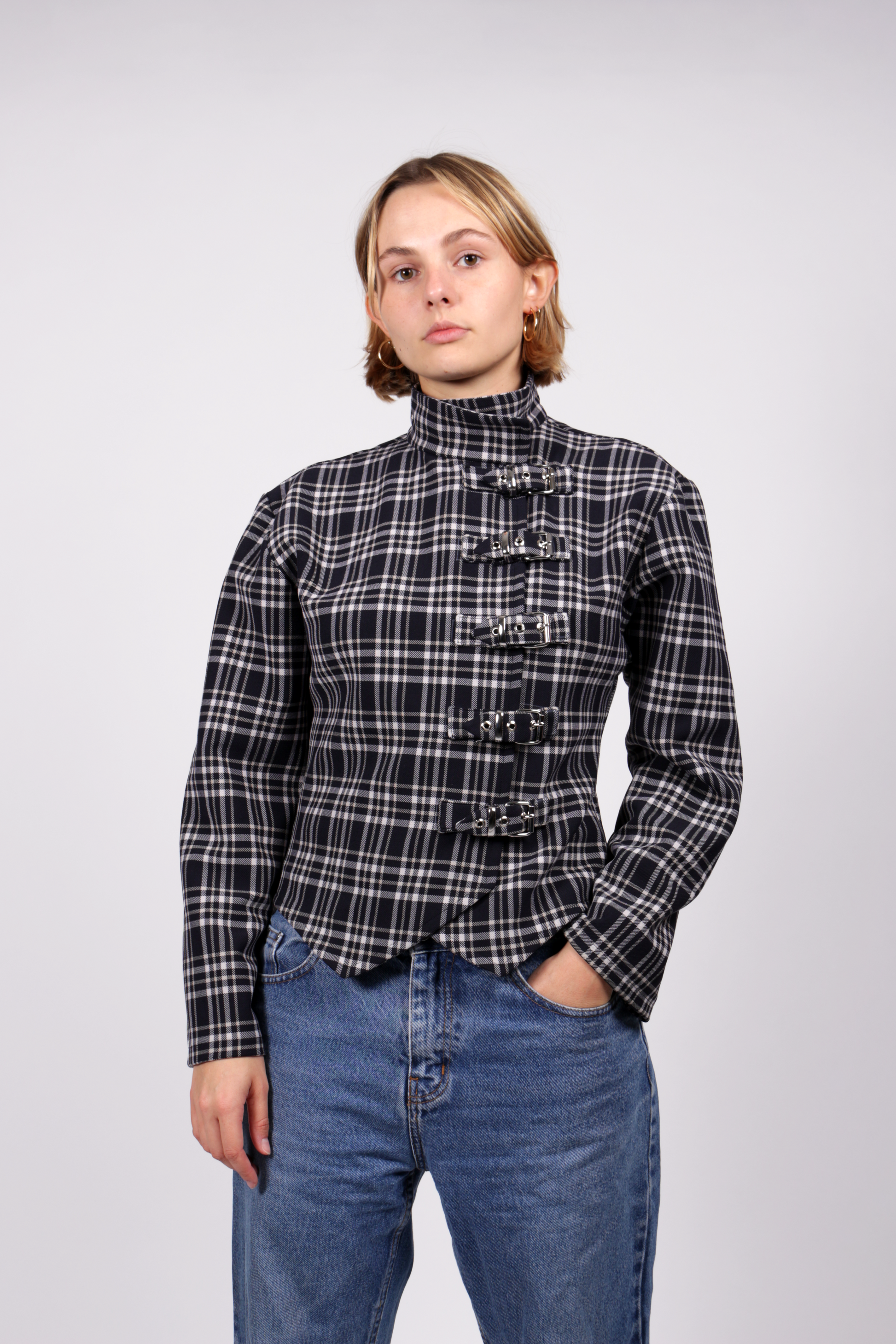 La veste Kurt est réalisée en tissus upcyclé en tartan bleu nuit, blanc et crème. Elle est réglable grâce à ses boucles en métal argentées.