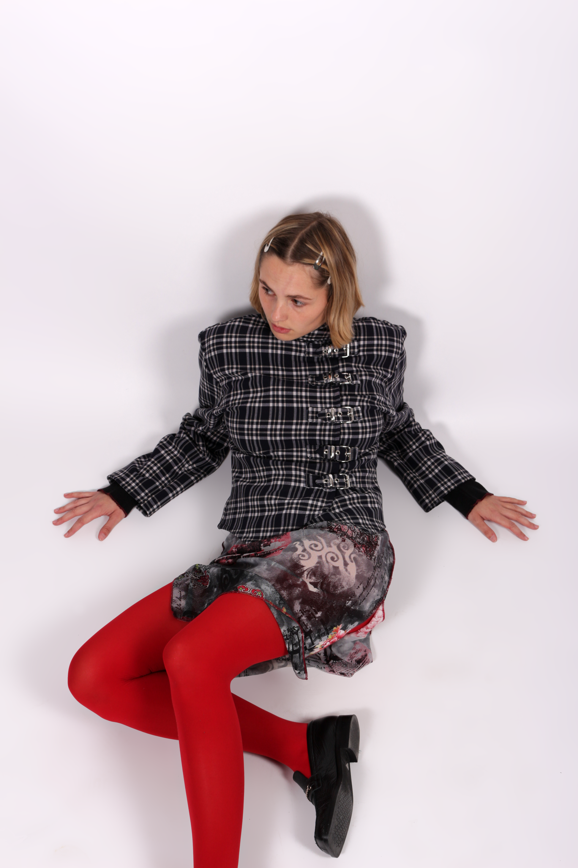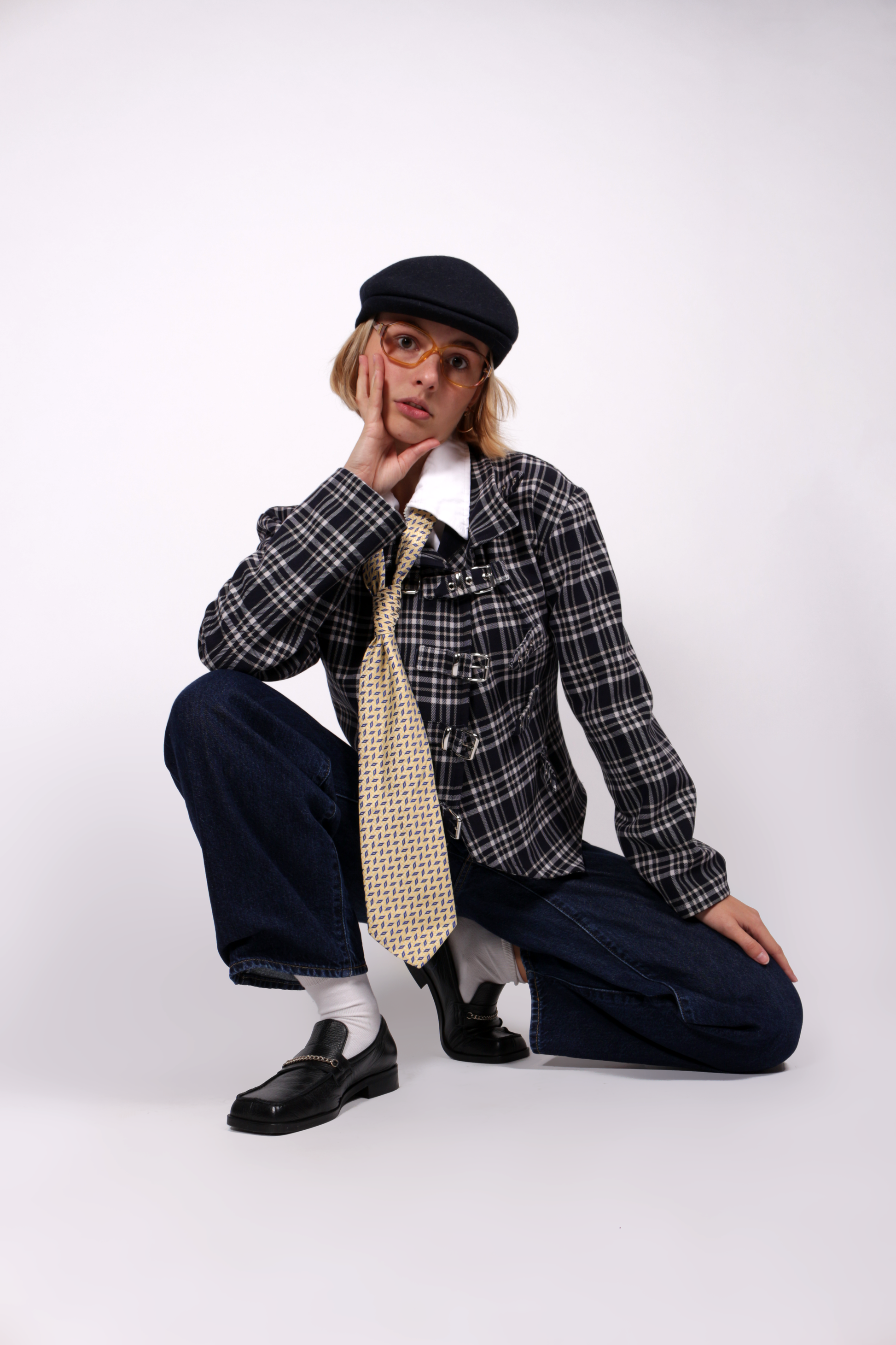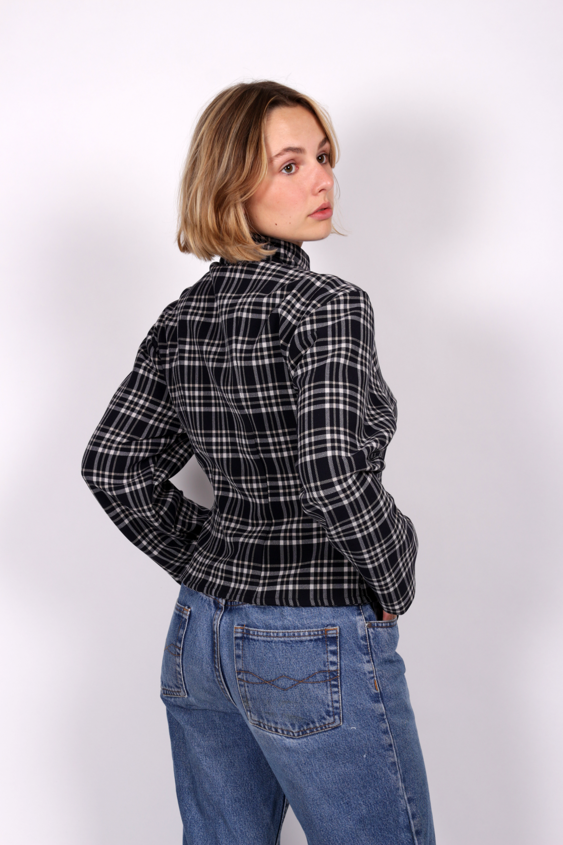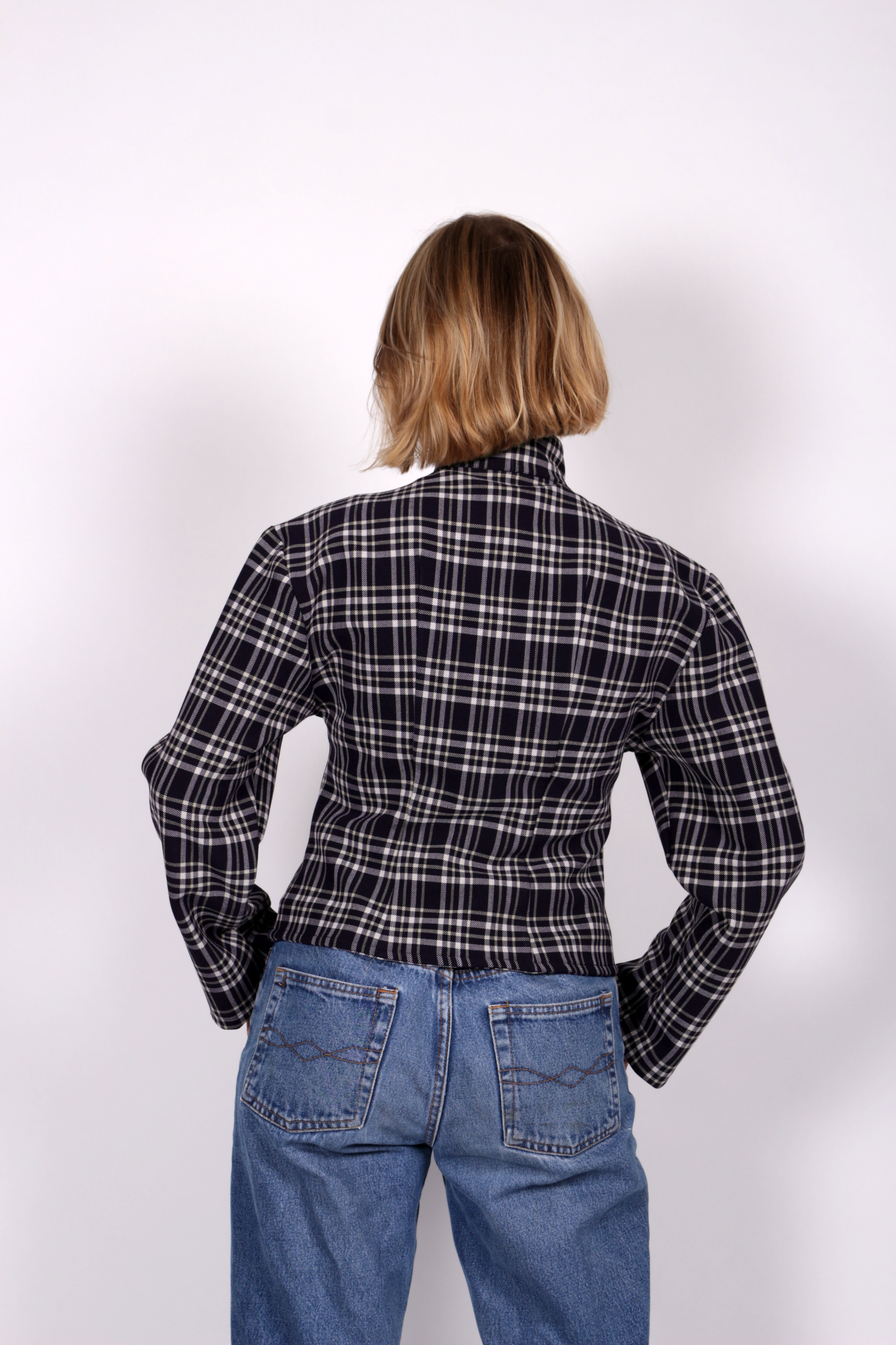 La veste Kurt est réalisée en tissus upcyclé en tartan bleu nuit, blanc et crème. Elle est réglable grâce à ses boucles en métal argentées.
